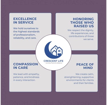 At Crescent Life, LLC At Crescent Life, everything we do is grounded in four guiding principles that shape how we support individuals, families, and caregivers—calmly, respectfully, and with excellence.